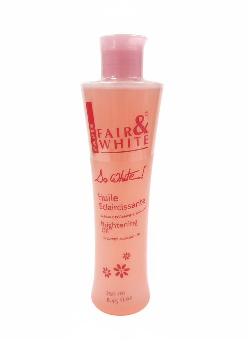 Le produit est une Huile Éclaircissante (Brightening Oil) de la gamme So White ! de la marque Fair & White Paris. Il s’agit d’un soin corporel conçu pour nourrir la peau et unifier le teint.