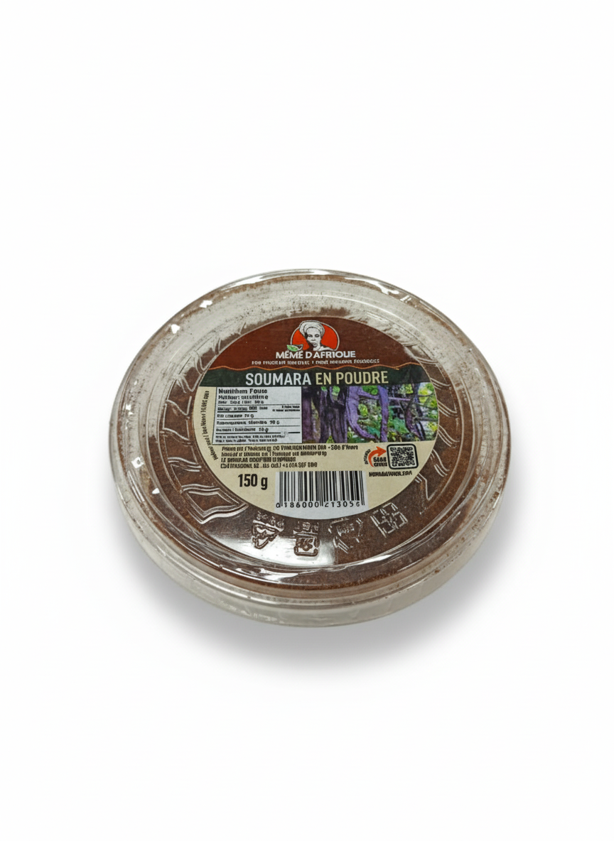 Le soumbala en poudre est un condiment originaire de l’Afrique de l’ouest, fabriqué à partir des graines fermentées de l’arbre appelé néré(ou plus rarement de soja). Il est utilisé comme exhausteur de goût naturel pour parfumer les plats et peut remplacer les bouillons cubes industriels. Il est apprécié pour sa saveur forte et son profil nutritionnel riche en protéines et minéraux.
